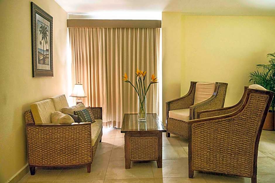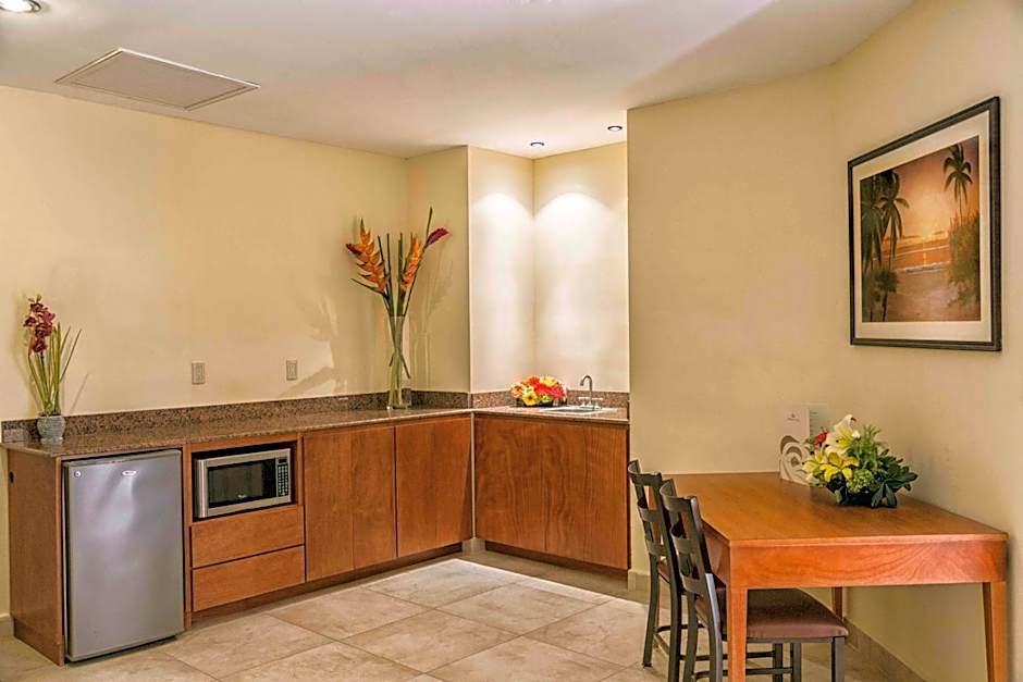This room offers a balcony with ocean views and a kitchenette with full size refrigerator, stove and microwave.